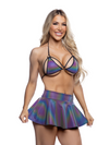 Shine brighter than the cosmos in our Galactic Gaze Reflective Outfit. This ultra-glossy two-piece features a futuristic oil-slick finish that shifts with the light, giving major space babe energy.